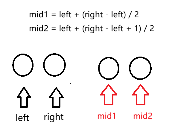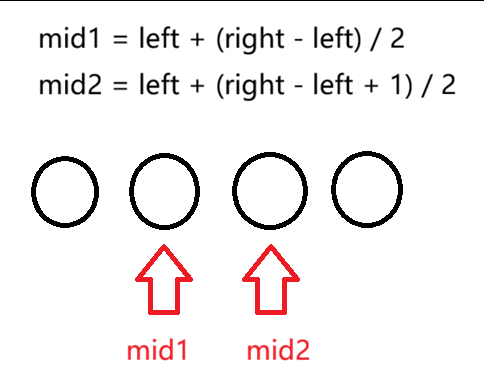 mid = left + (right - left) / 2 和 mid = left + (right - left + 1) / 2唯一的区别就是,当数组个数为偶数时,使用第一个式子计算出中间值,在左端;使用第二个式子计算出中间值,在右端。