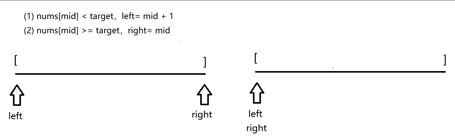 - 当n[mid] >= target 时,right = mid1 = left,也不满足循环条件,跳出循环。