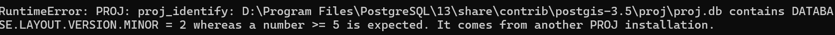 RuntimeError: PROJ: proj_identify: D:Program FilesPostgreSQL13sharecontribpostgis-3.5projproj.db contains DATABASE.LAYOUT.VERSION.MINOR = 2 whereas a number >= 5 is expected. It comes from another PROJ installation.