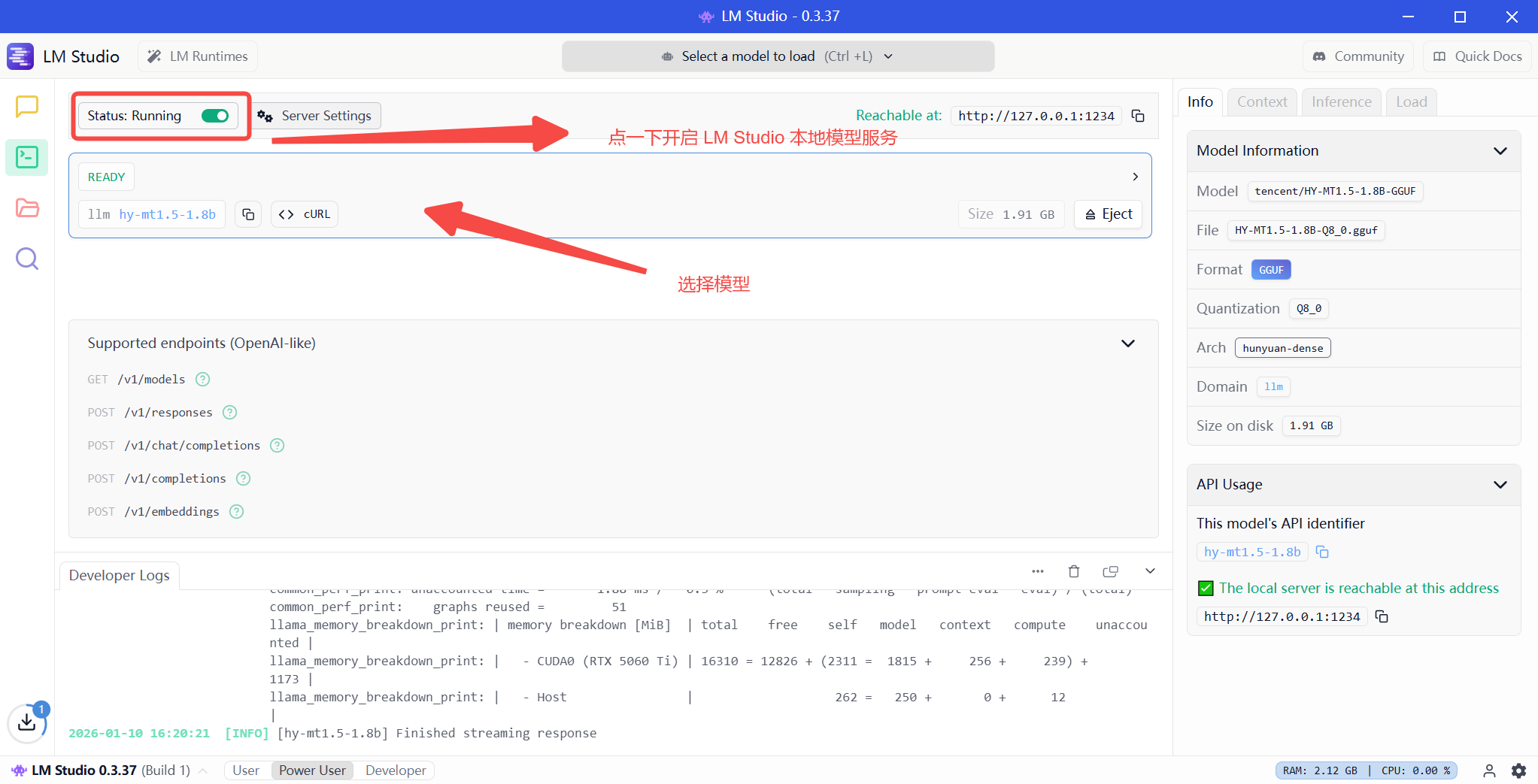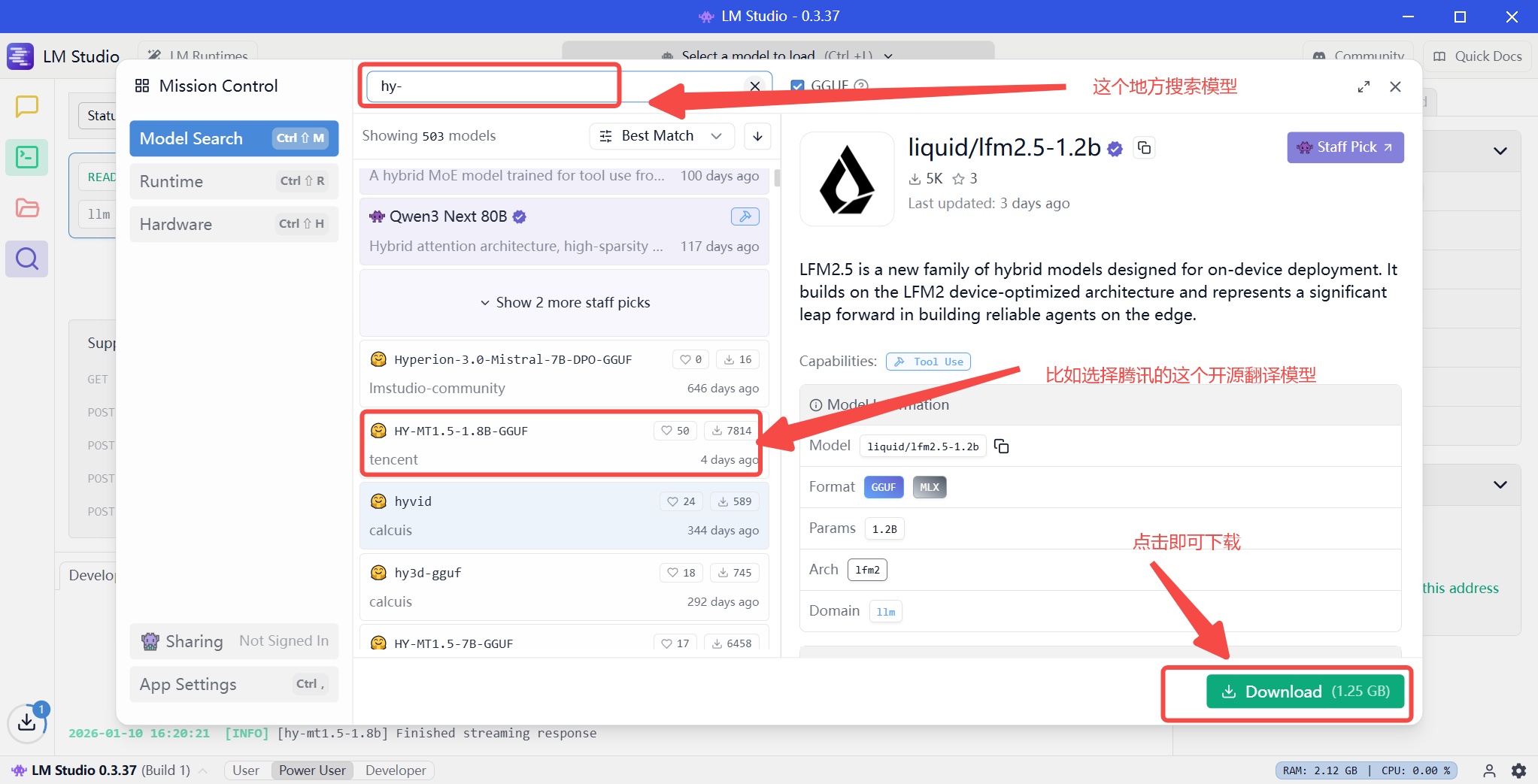 hy-mt1.5-1.8b或qwen/qwen3-14b,下载 - 加载模型 > Local Server > Start Server (端口 1234)。