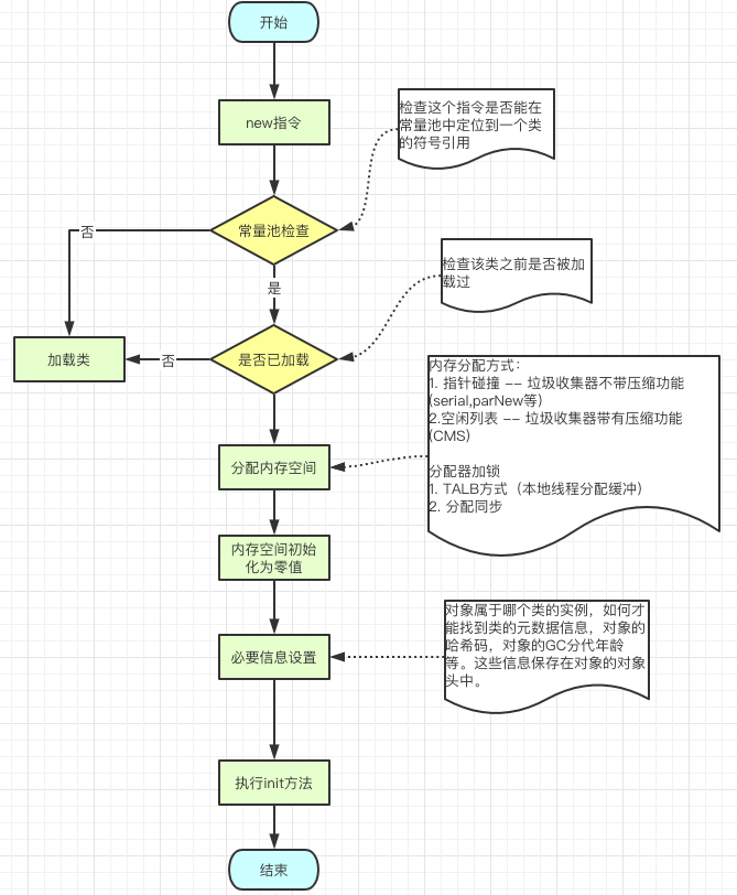 - JVM为新创建的对象分配内存空间。对象内存主要包括对象头、实例数据以及可能的对齐填充。