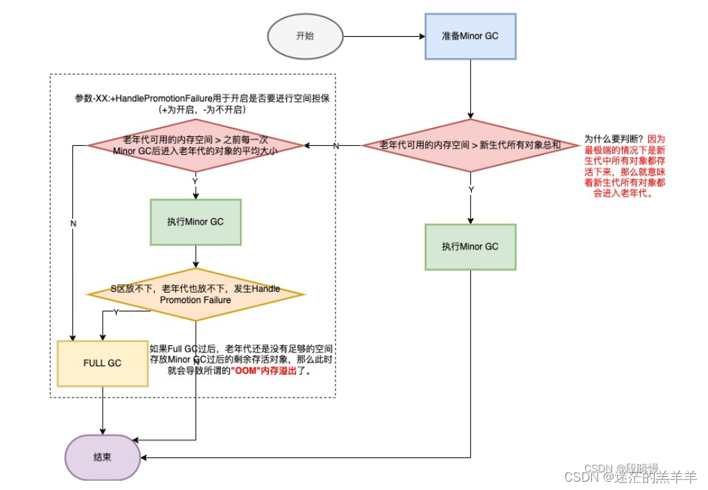 - 第一步:判断老年代可用内存是否小于新时代对象全部对象大小,如果小于则继续判断,大于则可进行MainorGC