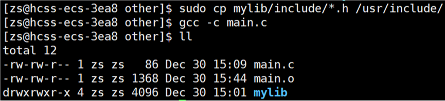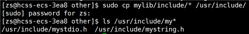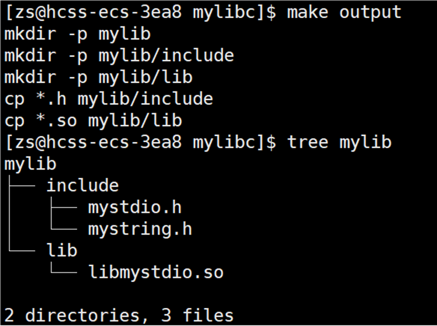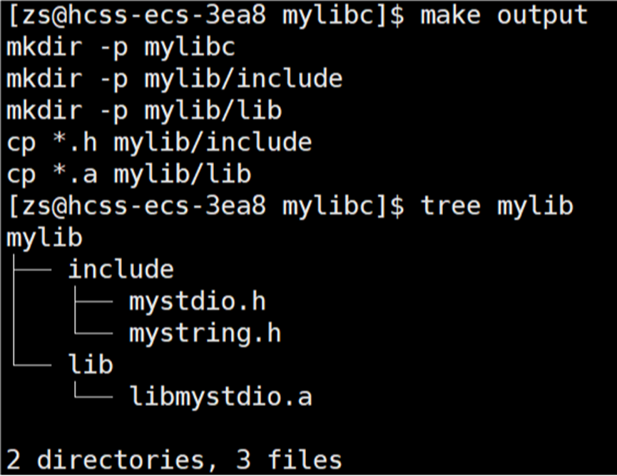 在当前路径下生成 mylib/include 和 mylib/lib 目录,将 .h 和 .a 分别拷贝到 include 和 lib 目录下。