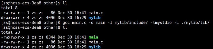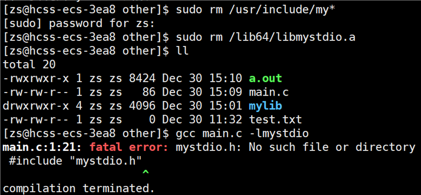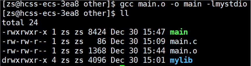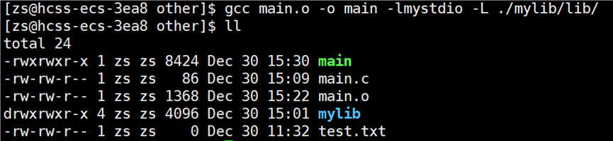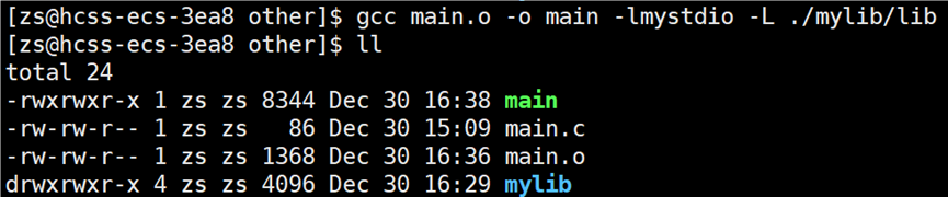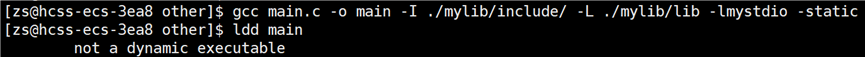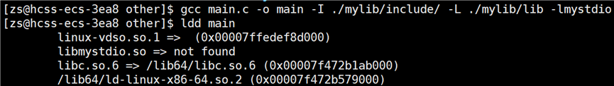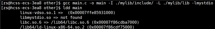 头文件找到了,但是要链接的静态库找不到呀?链接的静态库在 mylib 目录下。所以要告知编译器链接时,库文件在哪里找,使用指令:gcc main.o -o main -lmystdio -L ./mylib/include。