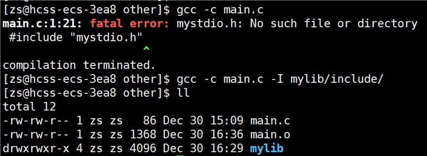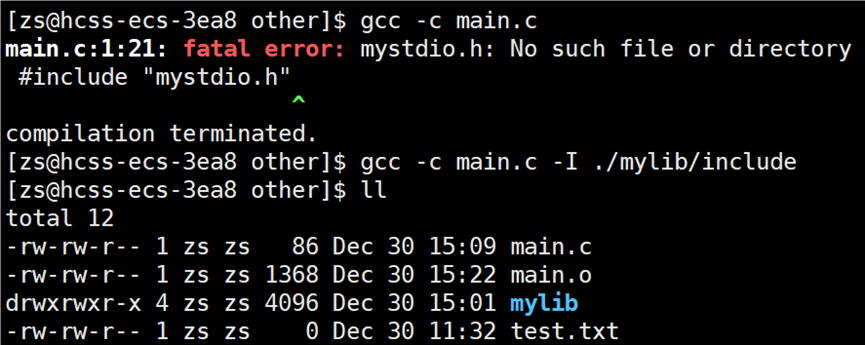 目前遇到的问题就是找不到 main.c 引用的头文件 mystdio.h 和 mystring.h,这两个头文件不在当前目录下,在 mylib 目录中。所以要告知编译器在编译 main.c 文件时,头文件在哪里找,使用指令:gcc -c main.c -I(大写i) ./mylib/include/,-I 选项:告知编译器除了当前和系统目录,-I指定的路径下也有头文件需要搜索。
