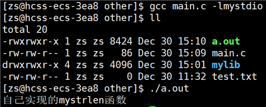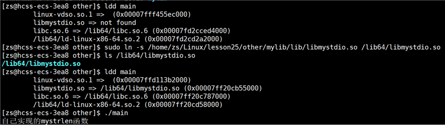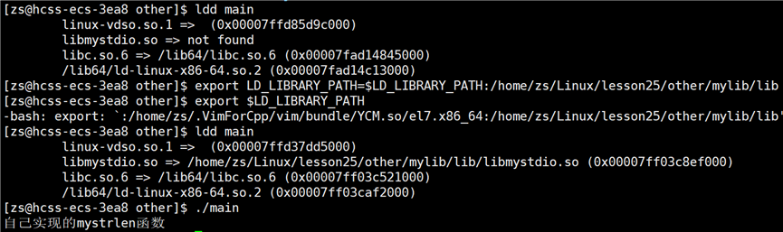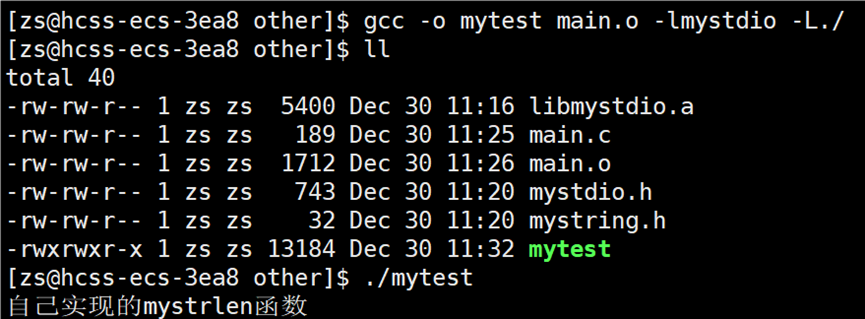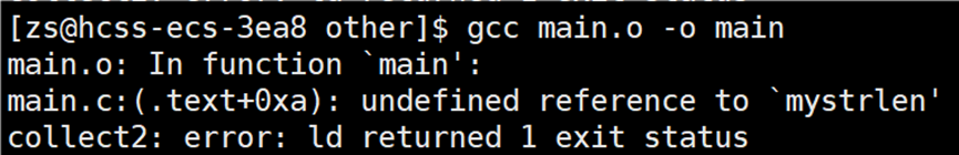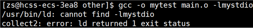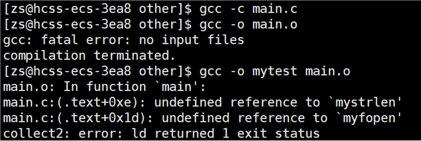 编译报错显示找不到mystrlen和myfopen函数,我们需要告知编译器链接的库文件是谁,使用选项:-l库文件名(-l 与 库文件名之间可以有空格,但是建议写在一起)
