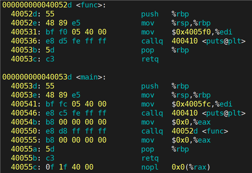 我们能够在可执行程序的反汇编信息看到 main 函数和 func 函数,这说明:在链接阶段,链接器将 main.o 和 func.o 中的代码段(.text)合并到了最终的可执行文件中。