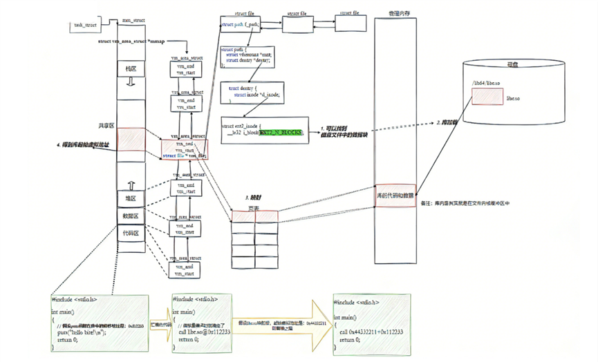 第三步是建立虚拟地址到物理地址的映射:库的内容被加载到物理内存,进程的页表建立从进程虚拟地址 → 物理页帧的映射关系;因此,库不仅有了虚拟地址,也关联了对应的物理地址。动态库在构建时,每个函数的地址是以 0为起始虚拟地址的偏移量记录的;运行时,函数的虚拟地址 = 库的加载起始虚拟地址 + 函数偏移量;而由于虚拟地址已通过页表映射到物理内存,其函数对应的物理地址也随之确定。