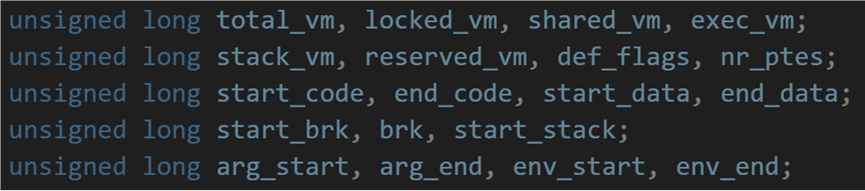 在mm_struct结构体存储着地址空间的分布界线,从哪里哪里开始,到哪里哪里结束: