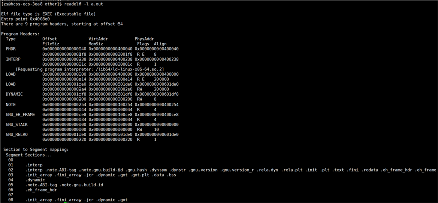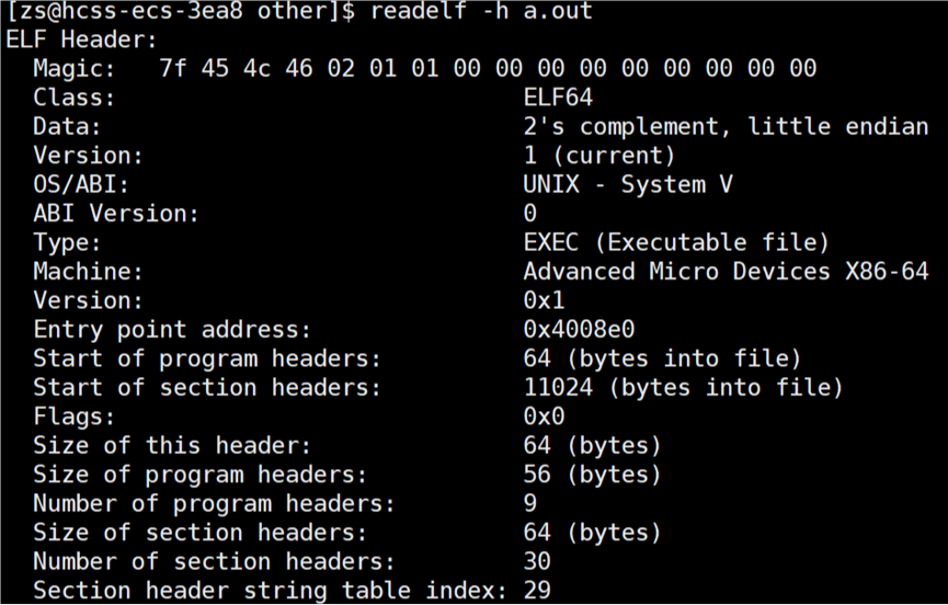 查看 a.out 可执行程序的 ELF Header 信息: