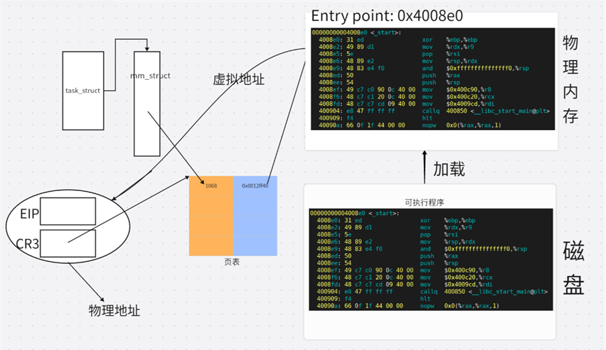磁盘形成可执行程序时,采用的是平坦模式 。在链接阶段,链接器会为代码和数据分配虚拟地址 ,这些地址作为元数据写入可执行文件(如 ELF 格式)中。因此,在磁盘上的可执行文件中,每条指令和数据项都已经关联了一个确定的虚拟地址。这些地址在数值上可以看作是"起始虚拟地址 + 偏移量"的形式。磁盘上可执行文件所记录的地址就是虚拟地址。这些虚拟地址在程序加载前就已存在,并在加载后由操作系统映射到进程的虚拟地址空间中。
