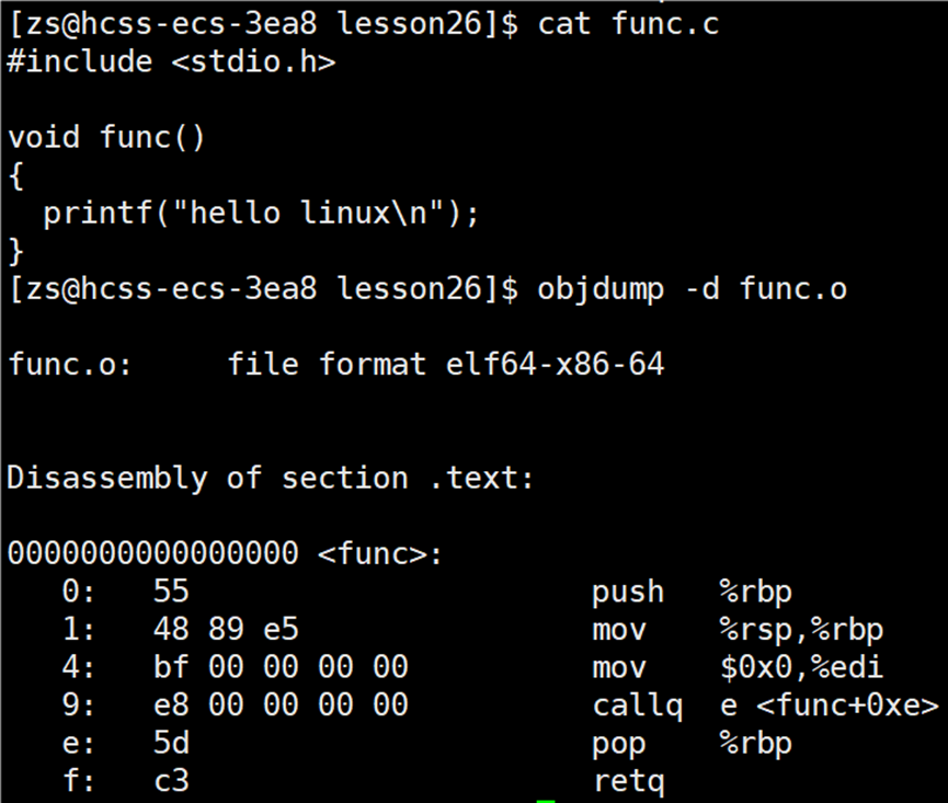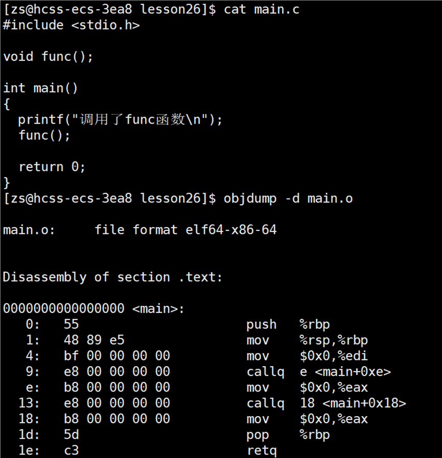 在 main.o 文件的反汇编信息中,可以看到 main 函数确实存在。其中有一条 callq 指令,其机器码为 e8 00 00 00 00,这表示调用了一个函数,但目标地址目前是全零 。同样,在 func.o 的反汇编中,func 函数也包含一条 callq 指令,其机器码同样是 e8 00 00 00 00,调用的是 printf 函数。e8 后面跟着的是全0,说明该函数调用的目标地址尚未确定。 此外,main.o 中还有一条 callq 指向 <main+0x18>,这是对 func() 的调用。虽然 func 定义在另一个 .o 文件中,但在链接前,其地址也未知,因此同样用 0x0 占位。所以,在 .o 文件中,只要调用了其他文件中定义的函数,即使有声明,其调用地址也会在反汇编中显示为全 0,表示"待链接时解析"。