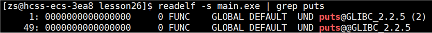 puts 方法是 glibc 库中的方法,但是这两个 puts 方法是 UND 的,这表明:虽然 puts 被调用,但其定义不在 main.exe 中,而是来自外部共享库(即 glibc)。尽管 main.exe 是一个完整的可执行文件,但由于它是动态链接的 ,其中一些函数在编译链接阶段并未被"真正绑定"到具体地址,因此它们在符号表中仍然标记为 UND 。这意味着:这些函数的地址在程序运行前是不确定的 ,需要等到运行时由动态链接器从对应的共享库中查找并解析。所以我们可以得出结论:对于动态链接的程序,必须先加载其所依赖的共享库,再执行程序本身。