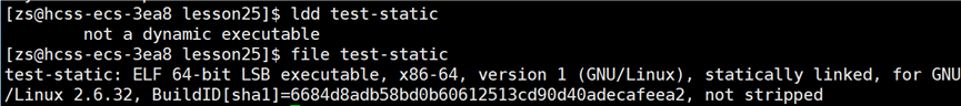 使用 ldd 和 file 指令查看 test-static 程序: