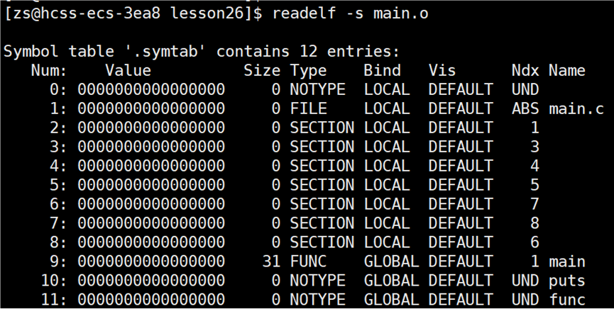 使用指令:readelf -s *.o,读取 .o 文件中的符号表信息。