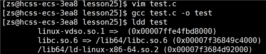 如何确认我们编写的C语言代码使用到C标准库呢?使用指令:ldd 可执行程序名,查看可执行程序所依赖的库: