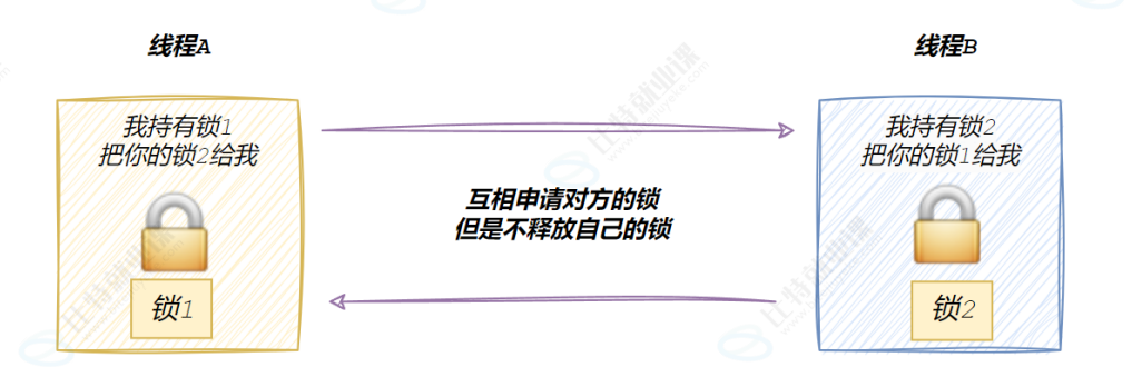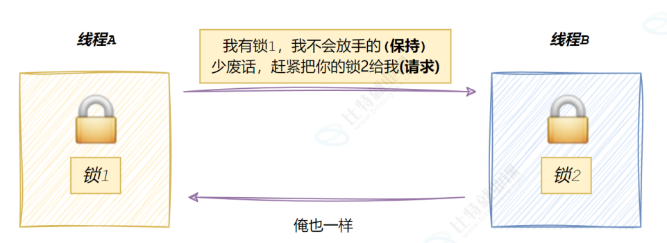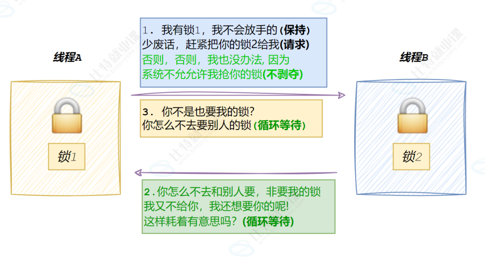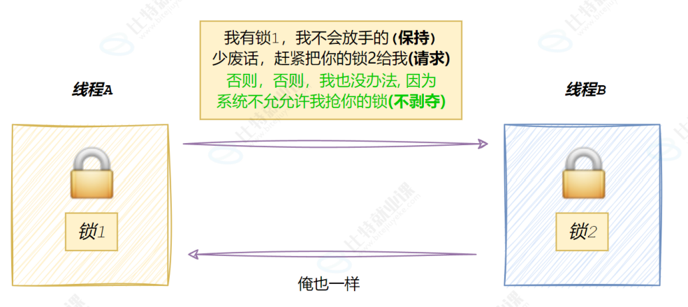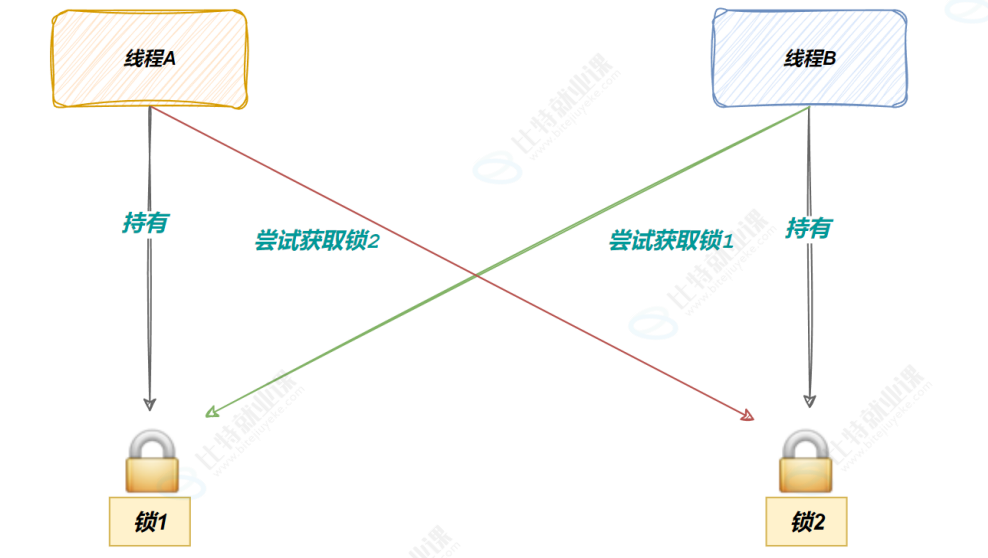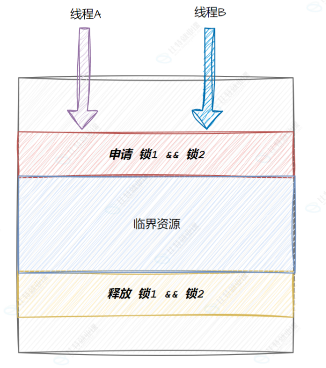 为了方便表述,假设现在线程A,线程B必须同时持有锁1和锁2,才能进行后续资源的访问: