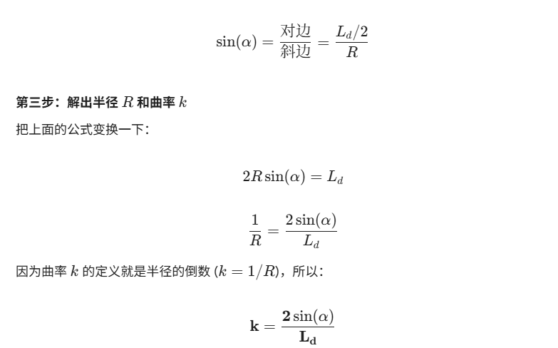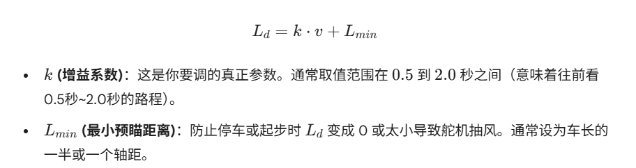 输出: 前轮转角。注意:Pure Pursuit 通常只负责横向控制(方向盘)。它不直接输出油门/速度(纵向控制),速度通常由另外的 PID 或逻辑控制。