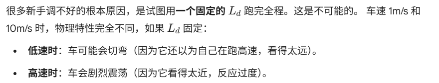 | 缺点 | 震荡 (Oscillation):稍微偏一点就猛打方向,容易"画龙"(S形走位)。 | 切弯 (Cut Corner):遇弯道时不减速直接抄近道,导致稳态误差大。 |