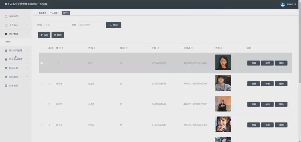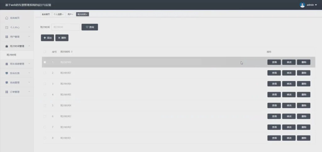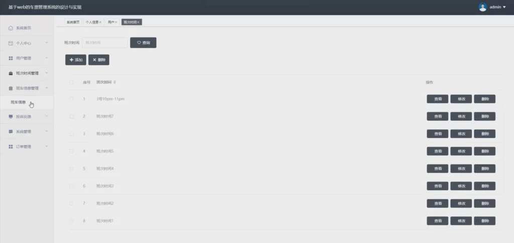 可对所有注册用户信息进行增删改查,包括账号、姓名、手机号、身份证号、头像及账户余额等,便于统一维护用户数据。 - 班次时间管理