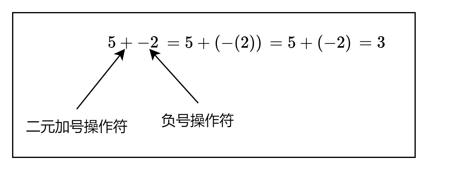 在表达式 " 5 − − 2 " "5--2" "5−−2"中,第一个 " − " "-" "−"代表二元的相减操作,第二个 " − " "-" "−"代表一元的取反操作。