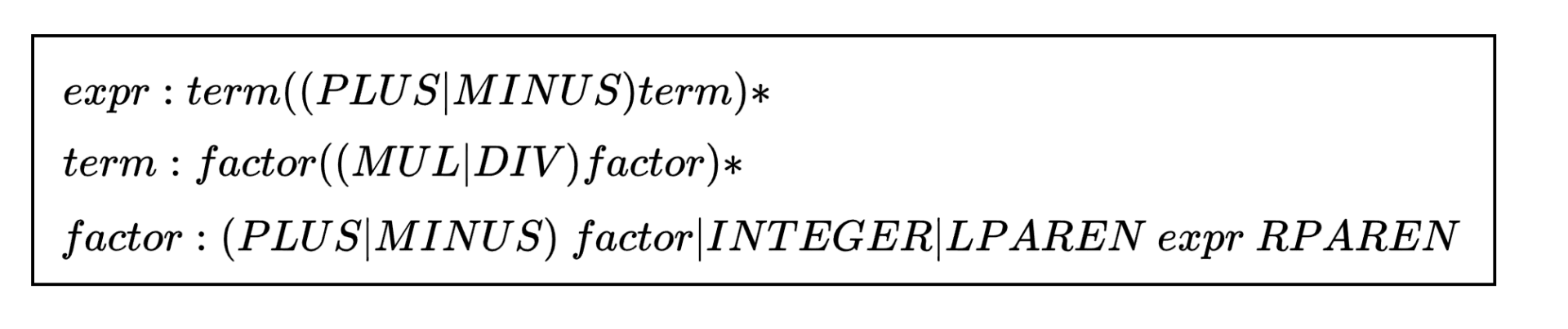 factor: (PLUS|MINUS)factor | INTEGER | LPAREN expr RPAREN