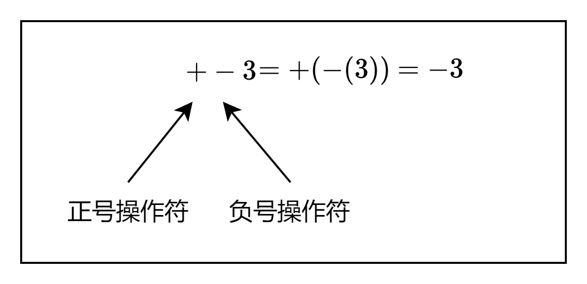 在表达式 " + − 3 " "+-3" "+−3"中,第一个 " + " "+" "+"操作符是正号操作符,第二个 " − " "-" "−"操作符是负号操作符。表达式 " + − 3 " "+-3" "+−3"和 " + ( − 3 ) " "+(-3)" "+(−3)"是等价的,最后的计算结果都是 − 3 -3 −3。你可以认为表达式中的 -3 是一个负的整数值,但是我们将其看作对正整数3的取反: