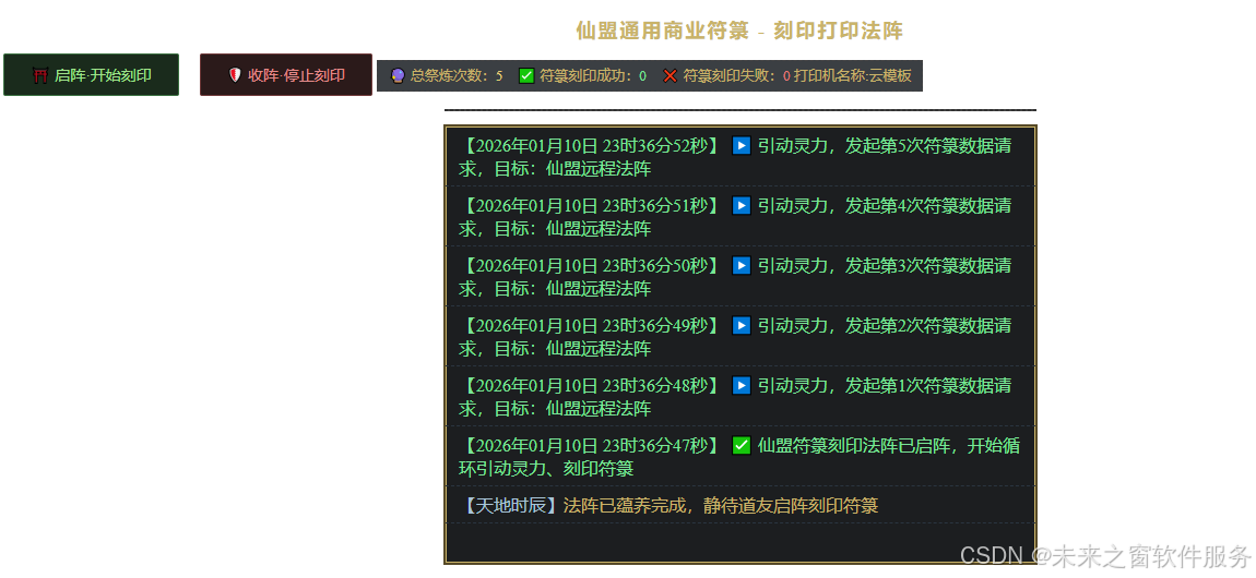 ▸ 操作规则(初学者只需要记住这 3 个点击规则,就完全够用了):✅ 要开始打印任务 → 点击【启阵・开始刻印】按钮,即可自动循环执行打印,全程无需管;✅ 要中途停止打印 → 点击【收阵・停止刻印】按钮,所有任务立即停止;✅ 任务完成后 → 系统会自动点击「收阵」,并显示关闭按钮,无需手动操作。