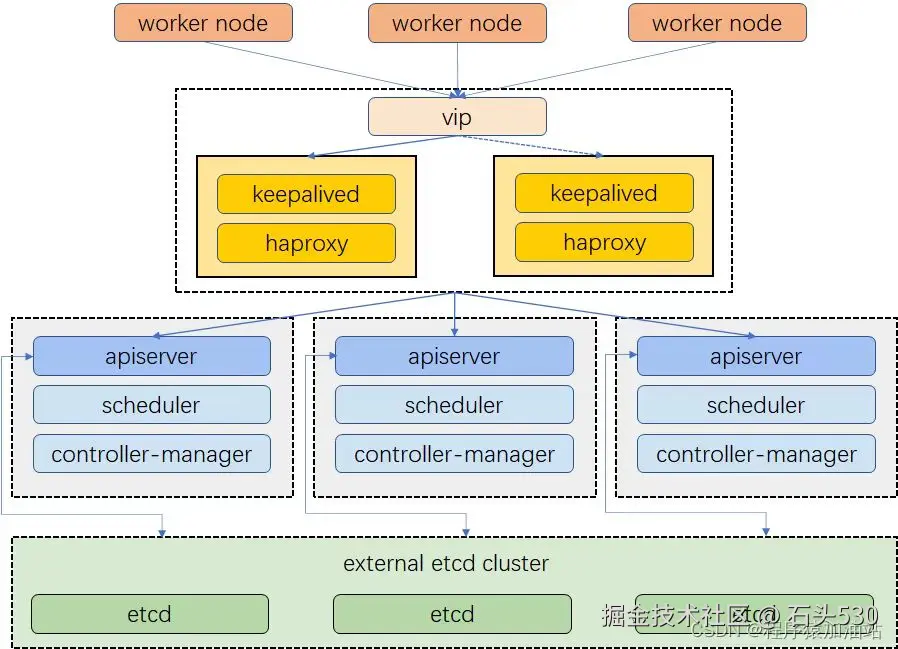- 多主多从集群:由多台Master管理节点和多Node工作节点组成,安全性高,适合生产环境使用;