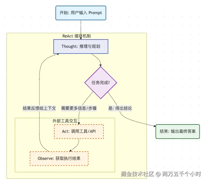 模型不再只是说话,而是遵循一个严格的循环: 观察 (Observe) -> 思考 (Thought) -> 行动 (Act)