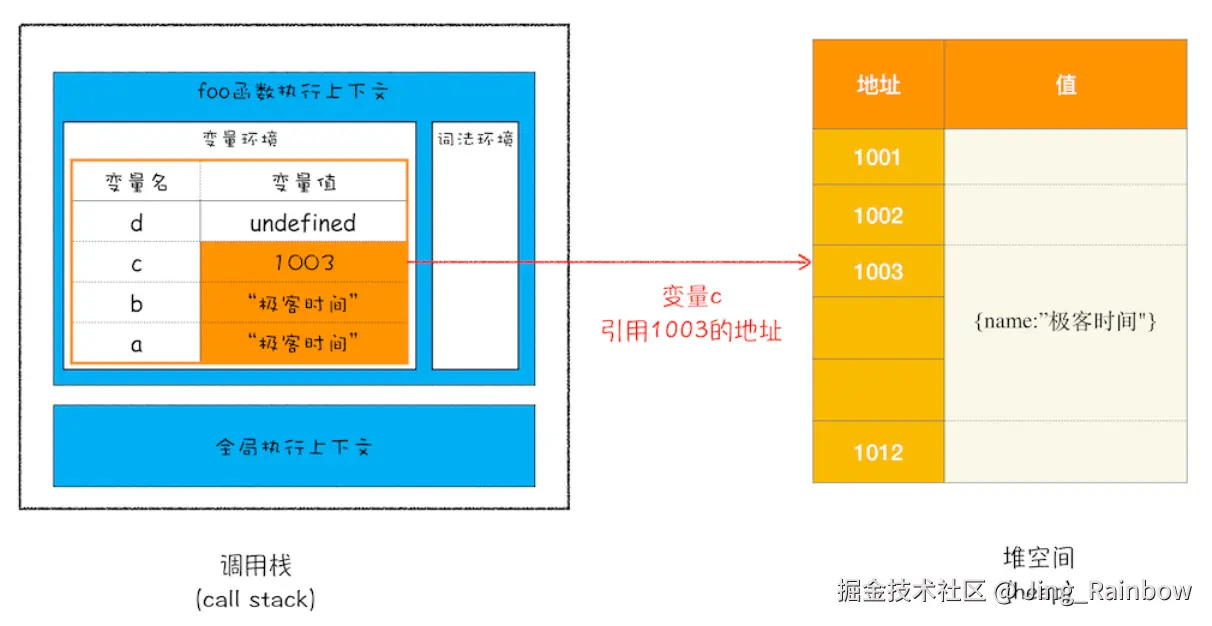 c并不直接存储对象{name: "极客时间"},而是保存一个指向堆内存地址(如1003)的指针。因此,当a修改对象属性时,b也会看到变化,因为它们共享同一个堆地址。