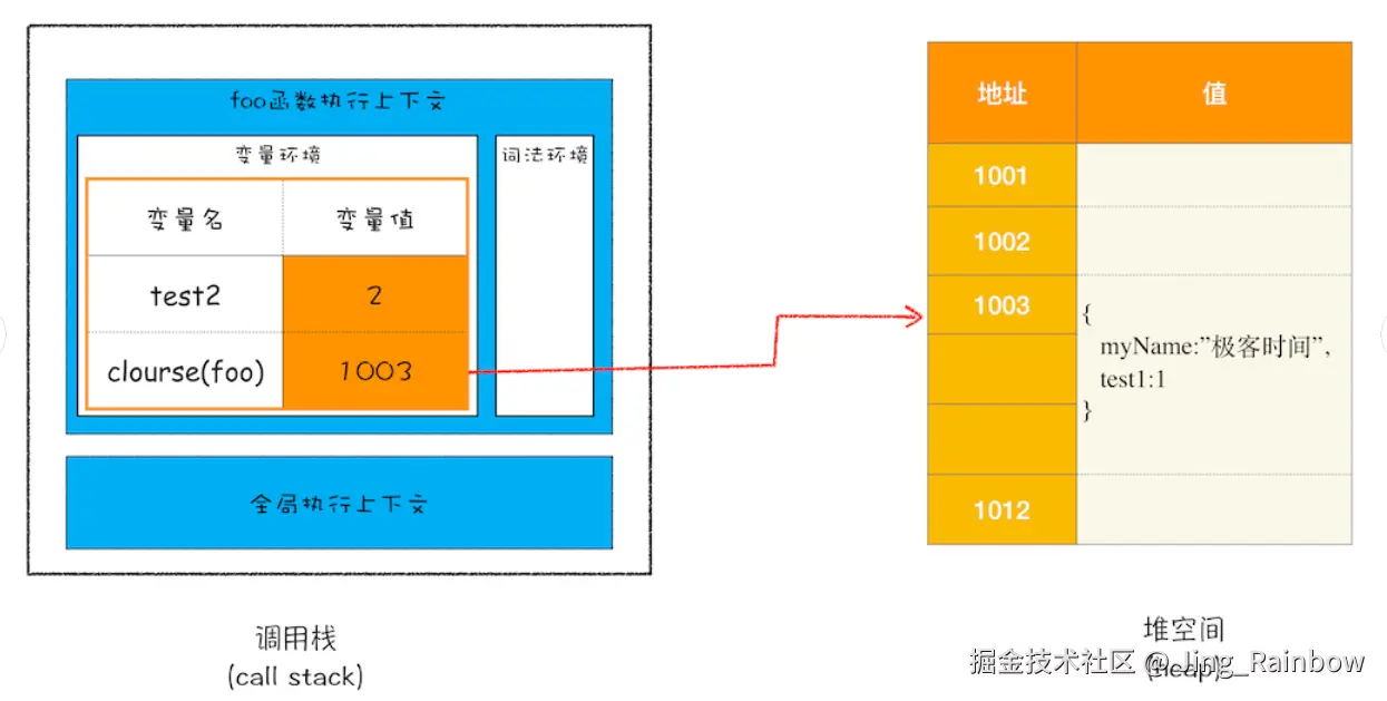 - 执行阶段:若存在闭包,V8 会在 堆内存中创建一个 closure 对象,保存被引用的外部变量