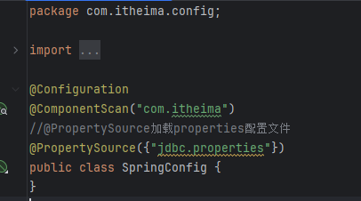 @PropertySource({"jdbc.properties"}):加载外部的jdbc.properties配置文件,这个文件中的属性可以被注入到Spring容器中的Bean。