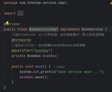@Qualifier("bookDao"):当有多个BookDao的实现时,@Qualifier用于指定注入的具体Bean(此处为bookDao)。如果没有使用@Qualifier,Spring会根据类型自动选择Bean,但如果有多个同类型的Bean,Spring就无法确定该注入哪个Bean。