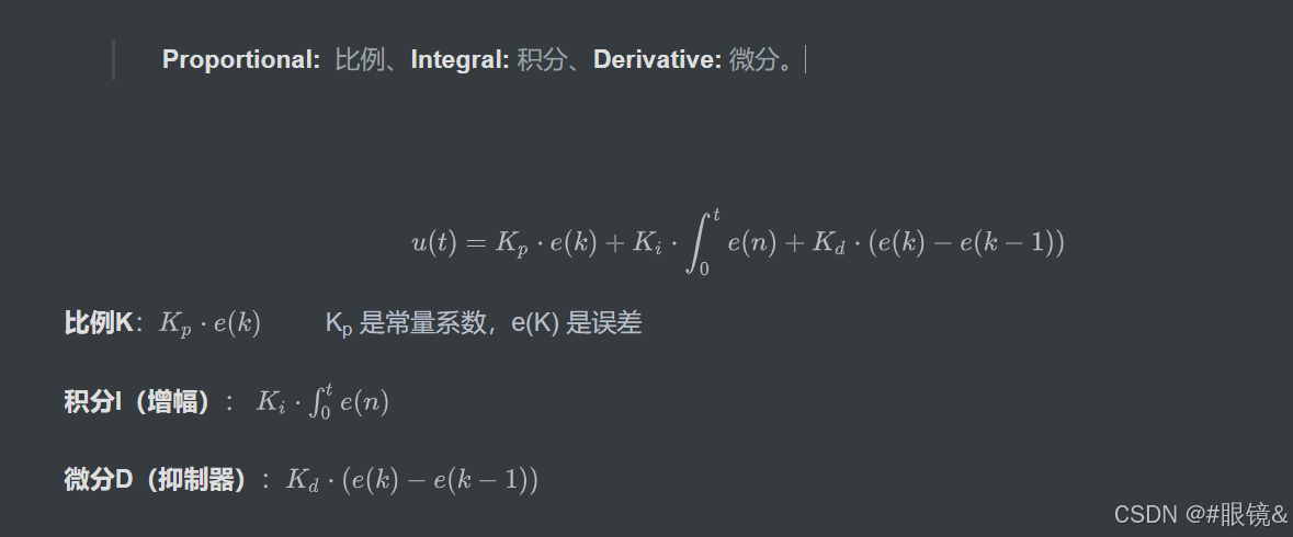 Proportional: 比例、**Integral: **积分、**Derivative: **微分。