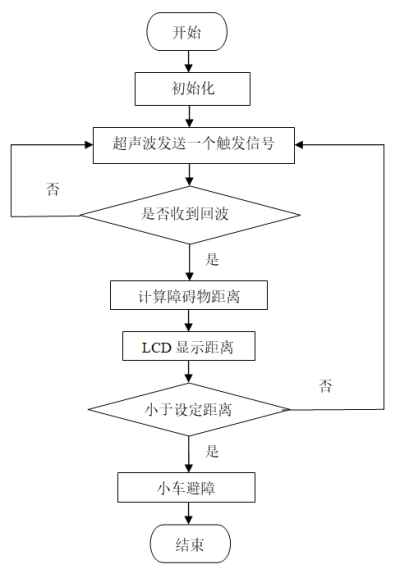 主程序的主要功能是:测量小车和障碍物之间的距离,并将结果通过单片机传递给LCD1602液晶显示屏,当测量出的结果超过预先设定的数值,蜂鸣器进行报警,小车躲避障碍物。主程序流程图如图3.1所示。