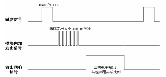 图2.4的时序图,可以看出:当在10s的高电平信号持续时间内,8个连续的频率为40Khz的方波将在模块的内部发出。当检测器信号的回波信号输出的,就可以根据高电平的持续时间将距离计算出来,因为在超声波测距时,两者之间成正比例。