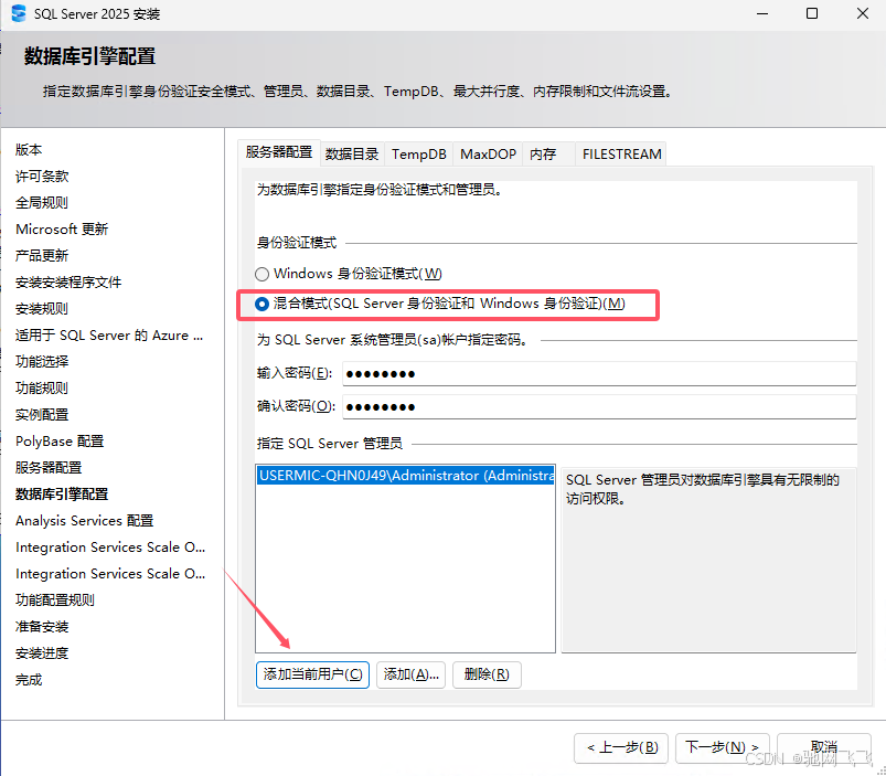 10、选择"混合模式",输入两次密码,添加当前用户,然后下一步