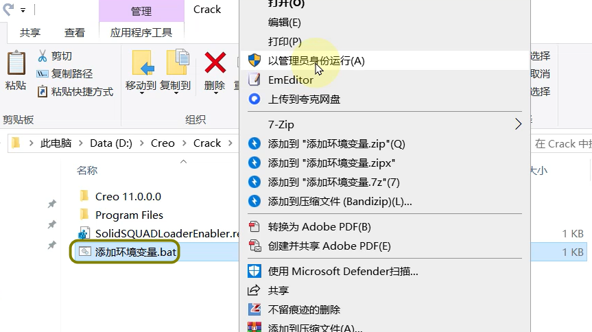 6、继续打开Crack文件夹选中 添加环境变量.bat 以管理员运行(黑框一闪而过不用管)