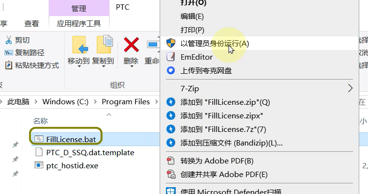 4、粘贴之后依次打开C:\Program Files\PTC文件夹选中FillLicense.bat以管理员运行