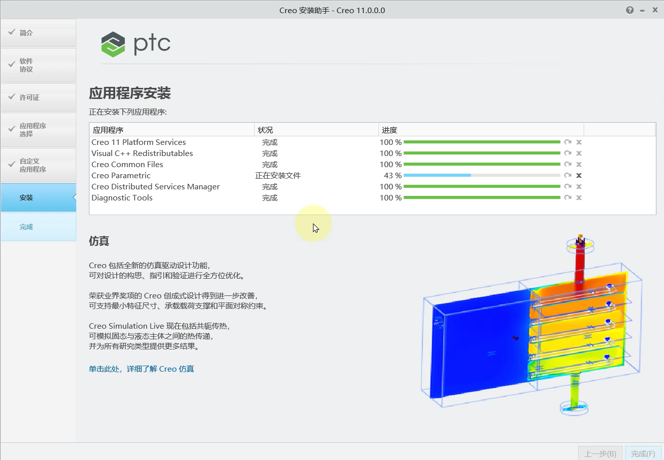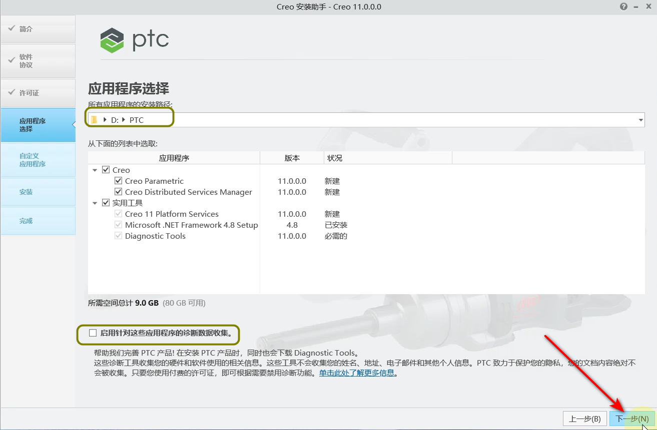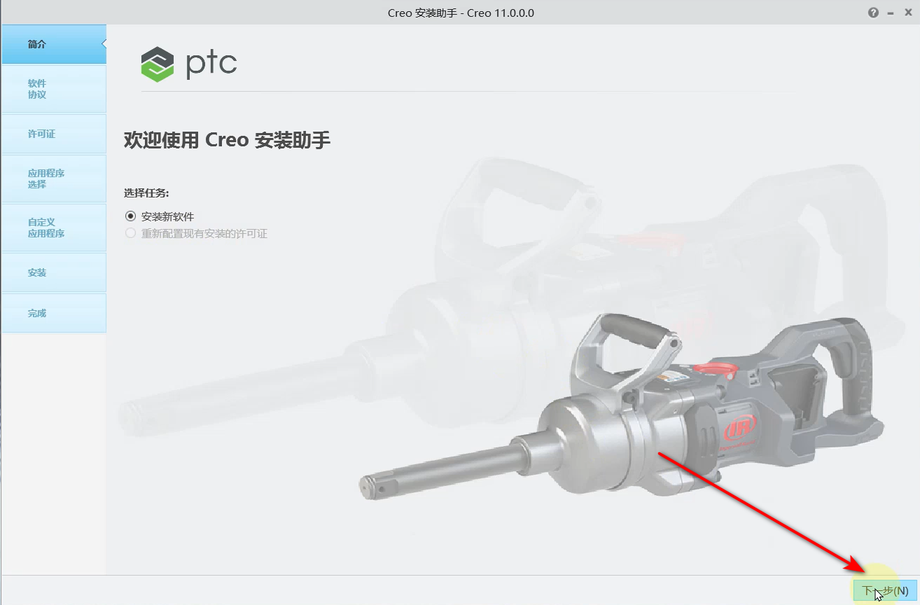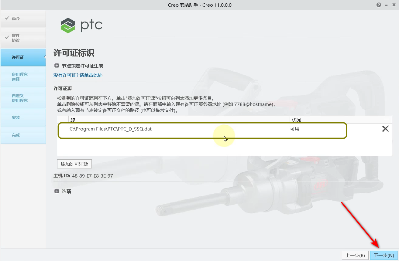 11、软件会自动识别许可证(如果没有识别,将之前(第4步)生成的"PTC_D_SSQ.dat"文件拖动到许可证位置),状况处显示"可用",说明没有任何问题,直接点击"下一步"