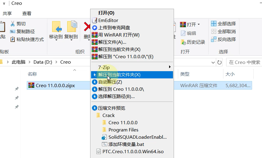 7、返回解压出来的文件夹找到PTC.Creo.11.0.0.0.Win64.iso点击装载 (如果没有 装载 选项可以右键选择打开方式 windows资源管理器打开,win7右键解压)