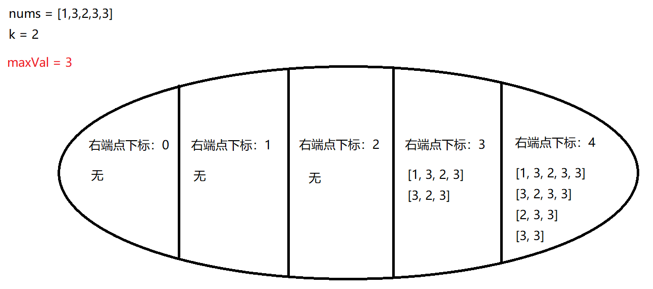 令 m a x V a l maxVal maxVal 为 n u m s nums nums 的最大元素,子数组性质:值为 m a x V a l maxVal maxVal 元素个数 ≥ k \ge k ≥k 。