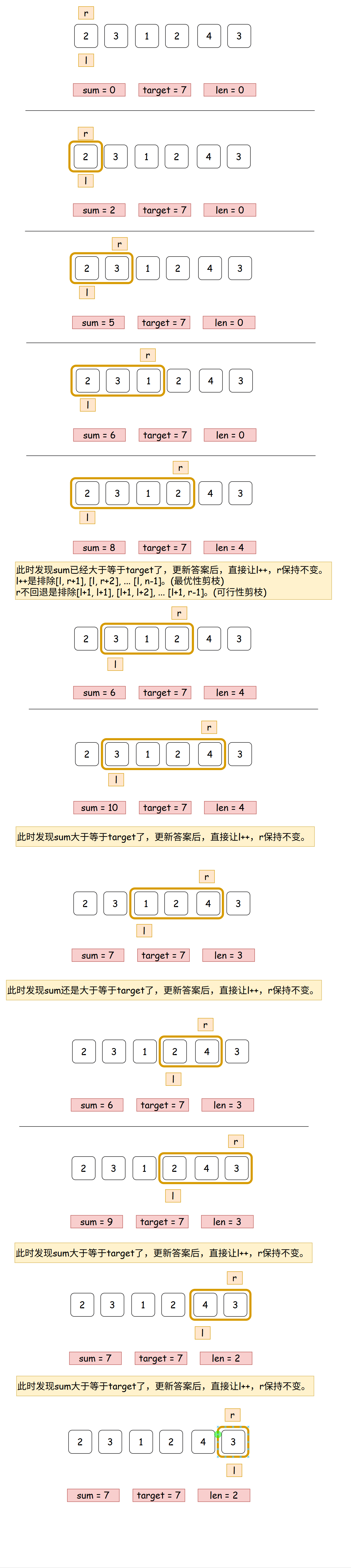 - 由于 n u m s nums nums 的元素都为正数,如果 [ l , r ] [l, r] [l,r] 区间的子数组满足性质,那么必然有 [ l + d , r ] [l+d, r] [l+d,r] 也满足性质,其中 d ≥ 0 d \ge 0 d≥0 且 l + d ≤ r l+d \le r l+d≤r。(越短越合法)