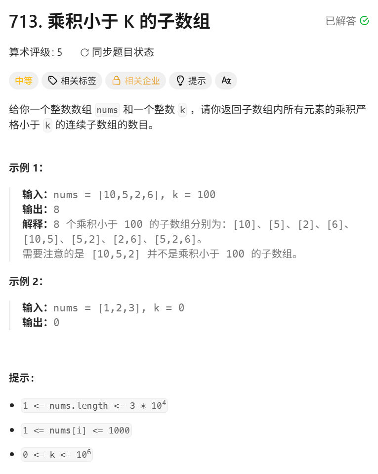 题目链接:713. 乘积小于 K 的子数组