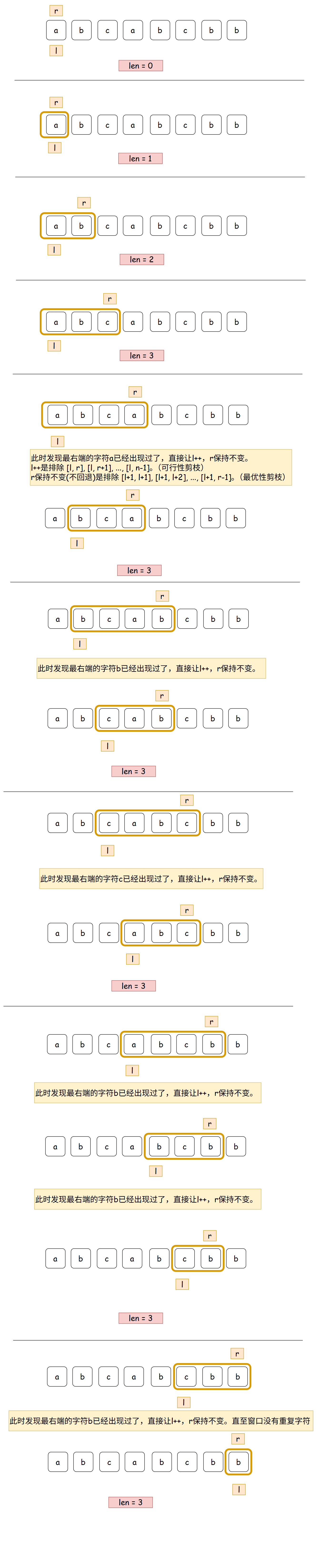 while(cnt[s[r]] > 1) // 不满足要求,这里l++,然后r不回退。