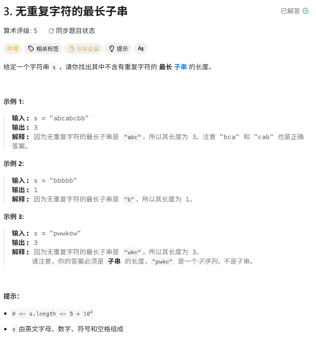 题目链接:3. 无重复字符的最长子串