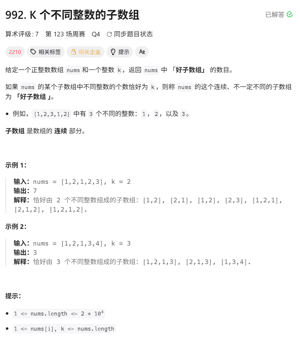 题目链接:992. K 个不同整数的子数组