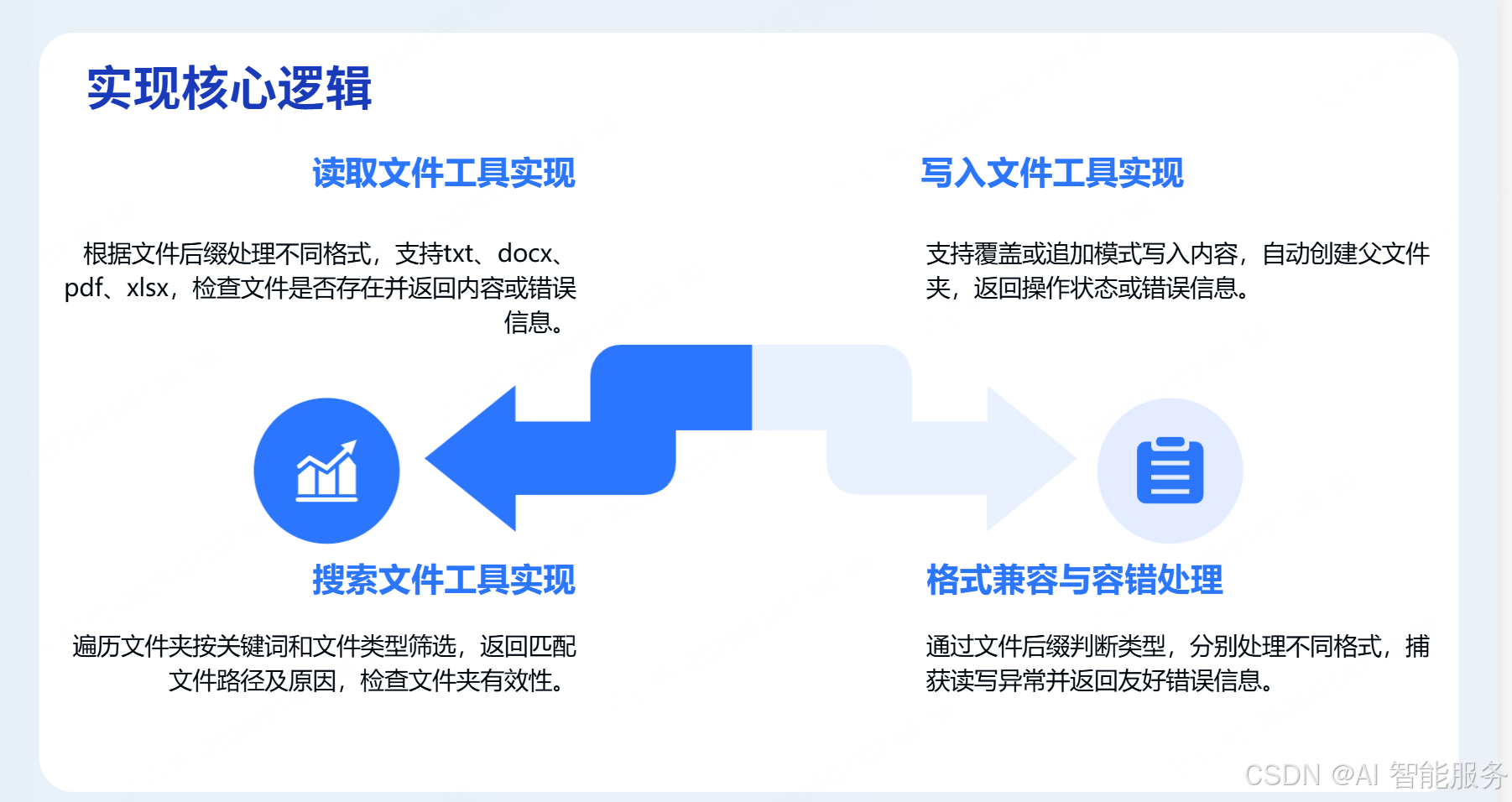 python-docx)、pdf(用PyPDF2)、xlsx(用openpyxl提取表格数据); - 容错处理:检查文件 / 文件夹是否存在、是否为有效文件 / 目录,捕获读写异常(如权限不足),返回友好错误信息;