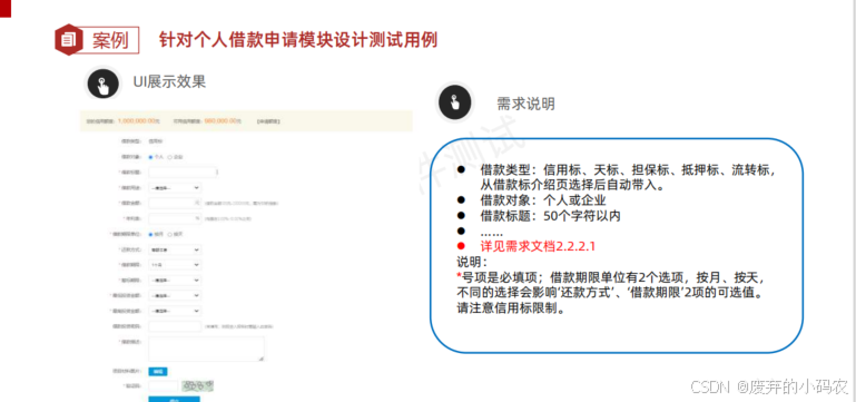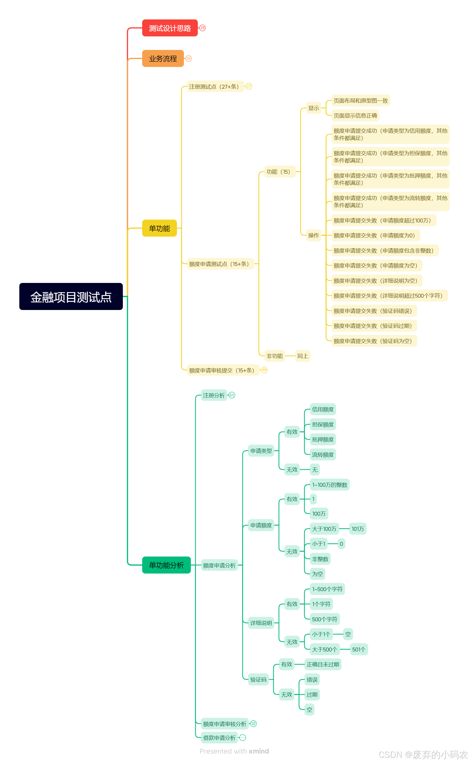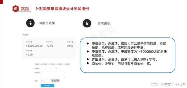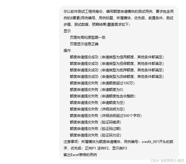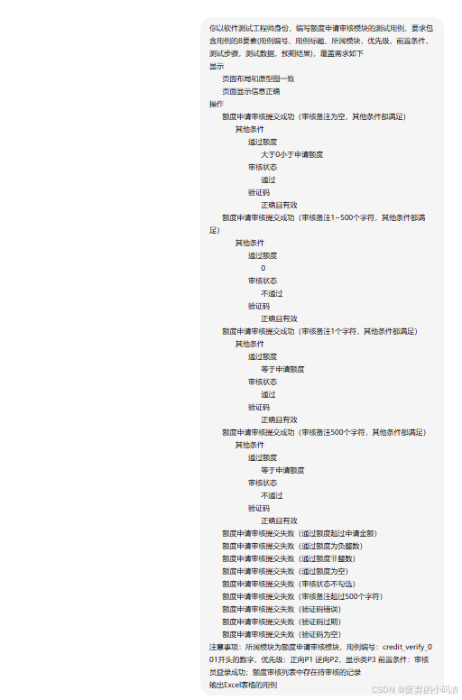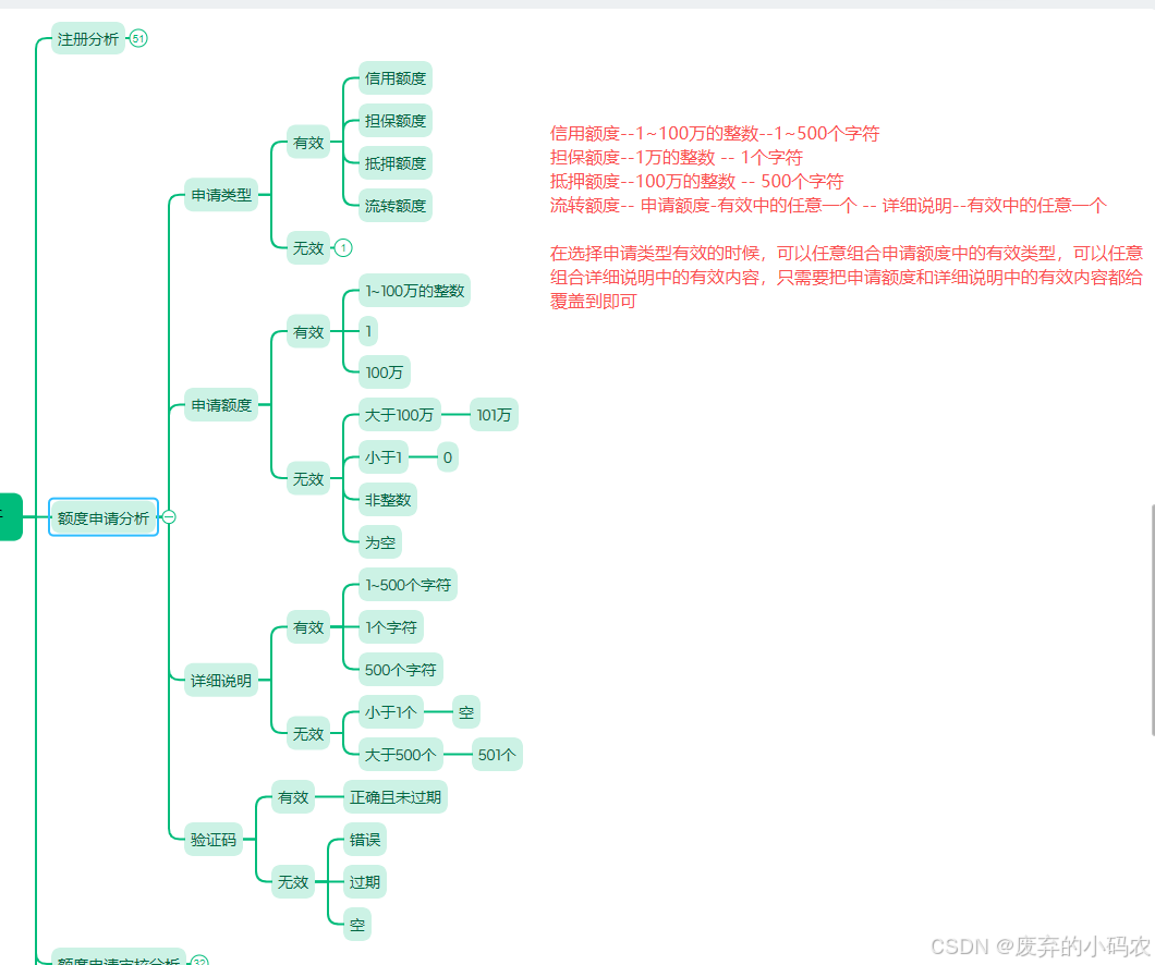 备注:1、获取到需求以后,先熟悉需求,熟悉完需求以后先考虑测试目的,如果不清楚测试目的,就去看标题,一般标题就是测试目的(比如:针对额度申请模块测试),基于该测试目的就去看操作,核心操作就是看提交是否能成功。当可以成功提交后,把每一个影响成功的条件都列举一下,然后优先考虑等价类,等价类的场景就是针对批量数据的大量测试,再加上有边界范围的时候考虑一下边界值,没边界范围的时候直接使用等价类即可(类似申请类型、验证码),最后算测试用例多少条如何计算,单条件中的有效最大数【比如单条件--申请类型,中的有效最大数是4个--信用额度,担保额度,抵押额度,流转额度】就是用例中成功的最大用例数【该用例成功的最多条数是4条】,因为最大的4个可以包含下面其他的有效数;无效比较简单,单个条件中有一项无效,就会有一条失败用例。用例总数就是有效+无效用例数。